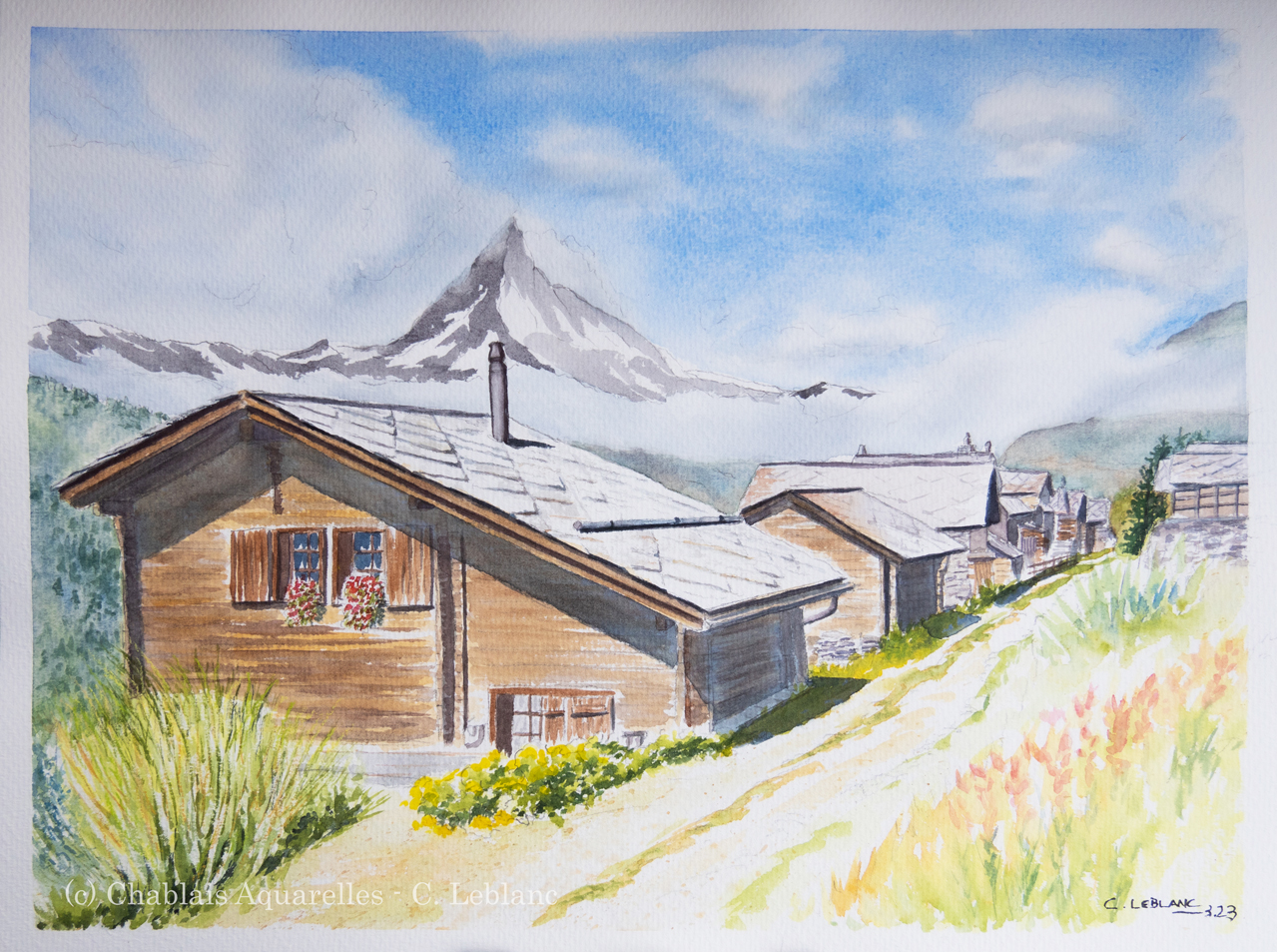 En arrière plan, le majestueux Matterhorn culmine du haut de ses 4’478m (Mont Cervin) et sort doucement de la brume. L’ambiance est douce et sereine, promesse d’une journée magique !